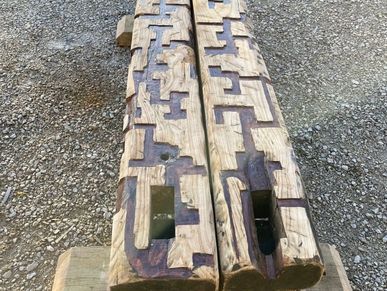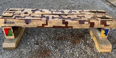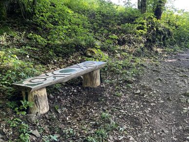 Un des quatre bancs donnés à la communauté Bluffy en 2023. Deux plateaux de banc ont été découpés depuis un seul pin de 500 mm de diamètre et équipé de pieds en souche de frêne. Celui ci est augmenter par incrustations en cuivre patiné et de motifs découpés à la toupie.