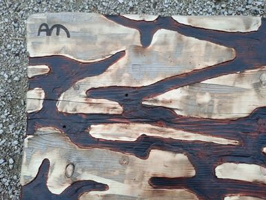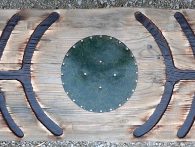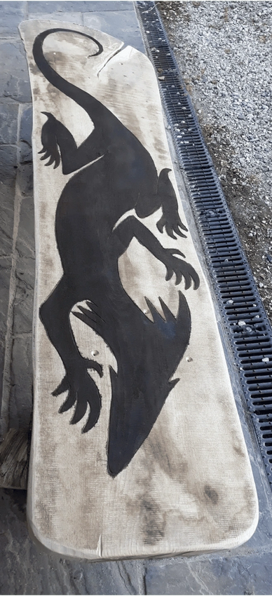 Fabriqué à partir d'une vieille dalle de bois de frêne taillée grossièrement et augmenté d'un contour ciselé d'un lézard. La coloration sombre était à base d'eau-alcool et est maintenant décolorée a cause de l'exposition au soleil.